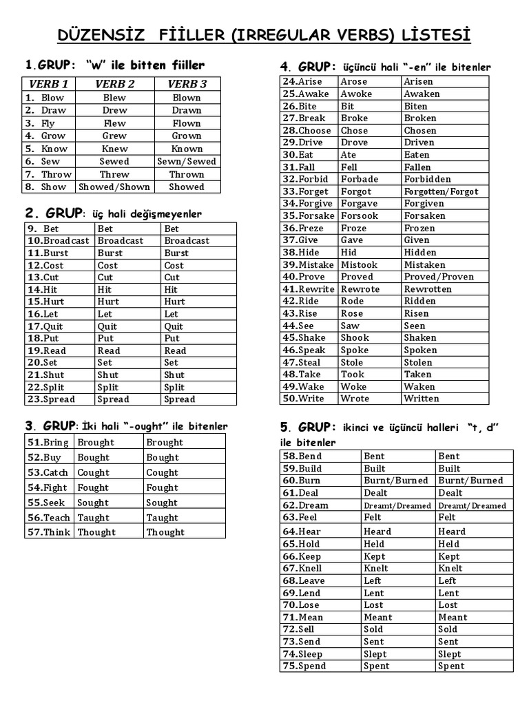 Ingilizce Duzensiz Fiiller Irregular Verbs Ingilizceturkce Gen Tr